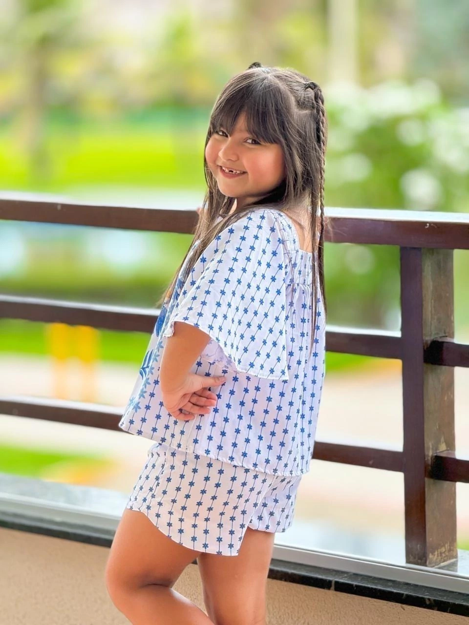 Estampa Exclusiva: Tecido branco com uma delicada padronagem de estrelas ou florezinhas em azul, que cria um visual leve e fresco.