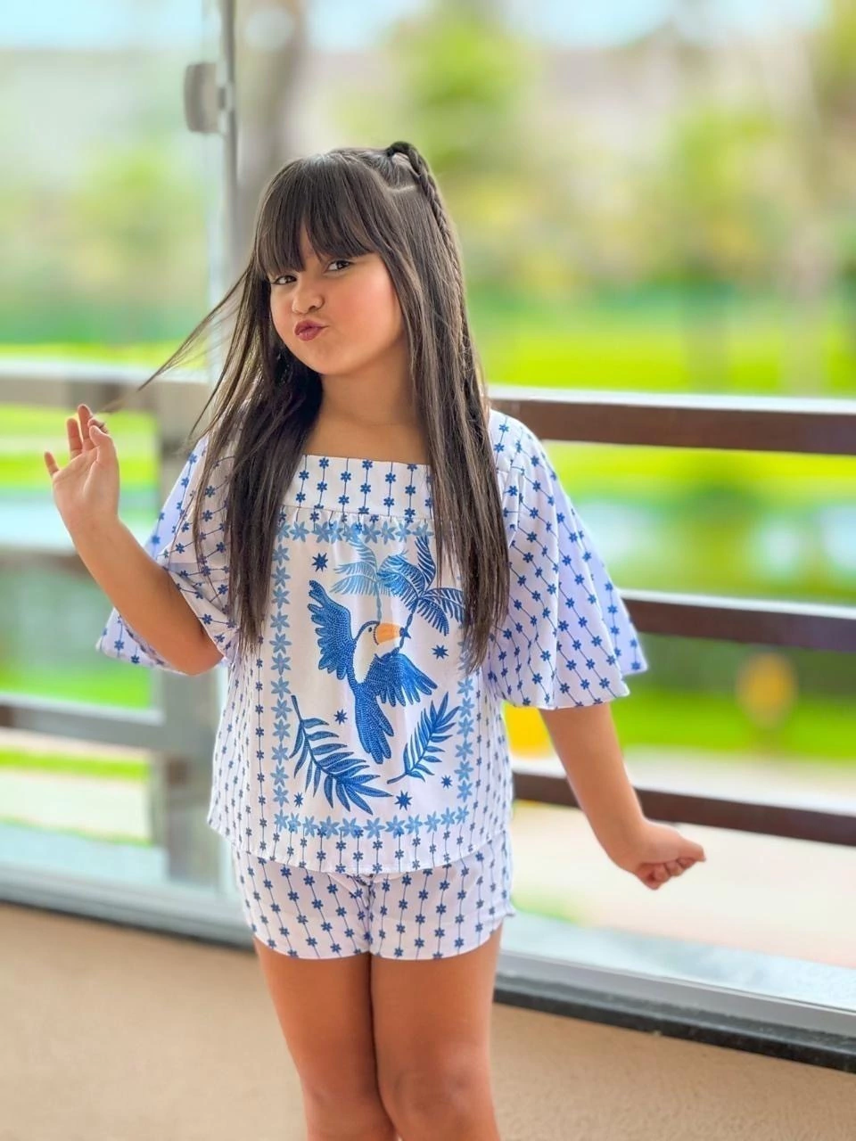 Shortinho Prático: O short segue a mesma estampa de fundo e possui um caimento confortável, ideal para brincadeiras. Detalhe de acabamento em babado ou rendinha na barra (dependendo do material), adicionando um toque de delicadeza.
