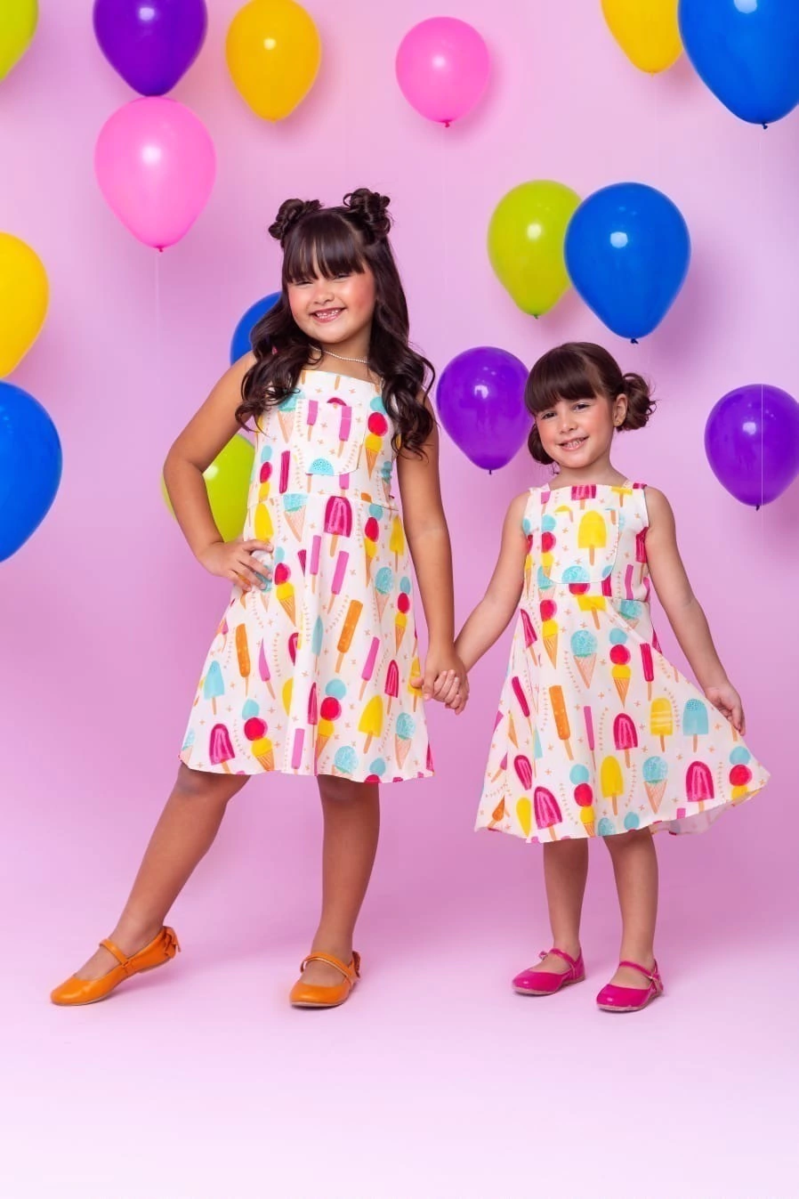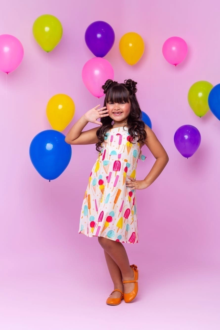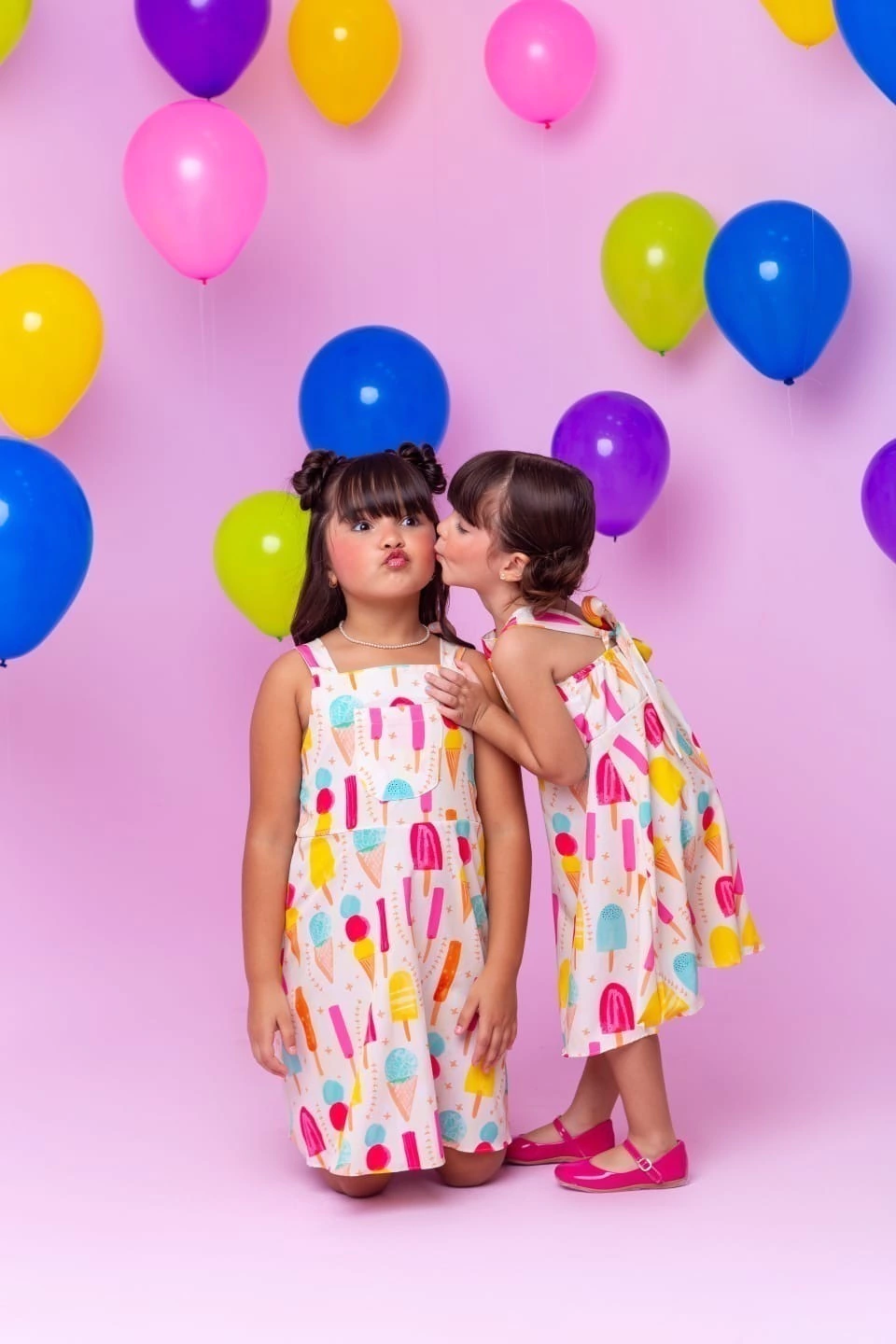 Prepare-se para derreter de amores com o Vestido Geladinho, a escolha perfeita para trazer alegria e diversão ao guarda-roupa da sua filha. Com uma estampa exclusiva e vibrante de picolés e sorvetes, ele é ideal para festas de aniversário, passeios de verão e momentos especiais cheios de sorrisos.