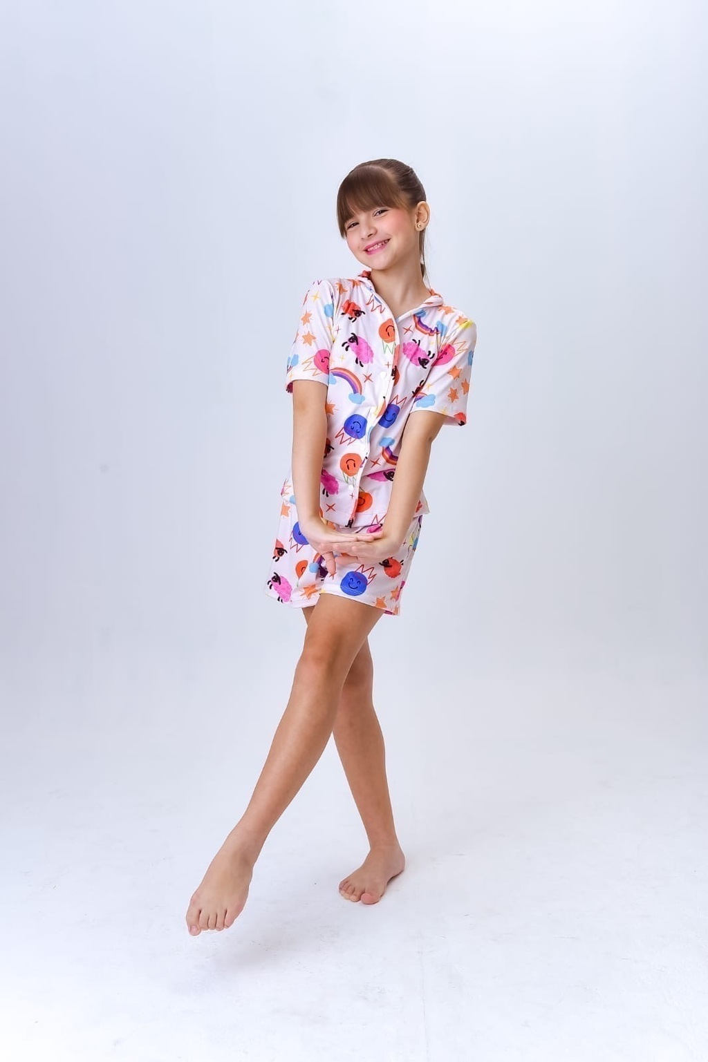 Apresente o Pijama Arco Íris, um lindo pijama em algodão muito confortável que traz o estilo americano para as suas noites. Este conjunto foi especialmente desenhado para meninas que adoram um toque de charme e suavidade.